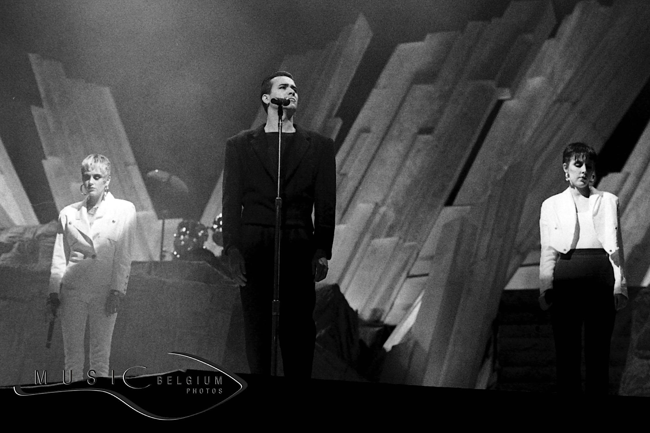 Foto: Phil Oakey in het midden met Joanne Catherall rechts op het podium van de Diamond Awards in het Sportpaleis van Antwerpen (België) in oktober 1990.